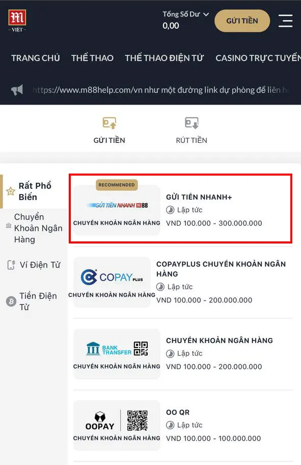 Tiếp theo, giao diện hệ thống sẽ hiển thị danh sách các kênh thanh toán. Bạn chọn mục Gửi Tiền Nhanh+ (thường có nhãn Recommended – Khuyên dùng). Phương thức này cho phép nạp từ 100.000 VNĐ đến 300.000.000 VNĐ mỗi giao dịch.