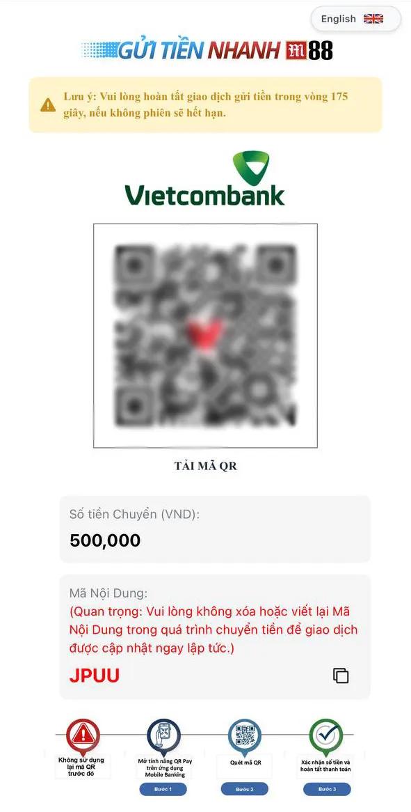 Mã nội dung: Hệ thống sẽ cung cấp một Mã Nội Dung gồm các chữ cái (ví dụ: JPUU). Bạn tuyệt đối không được xóa hoặc sửa đổi mã này trong phần ghi chú chuyển tiền để giao dịch được cập nhật tự động.