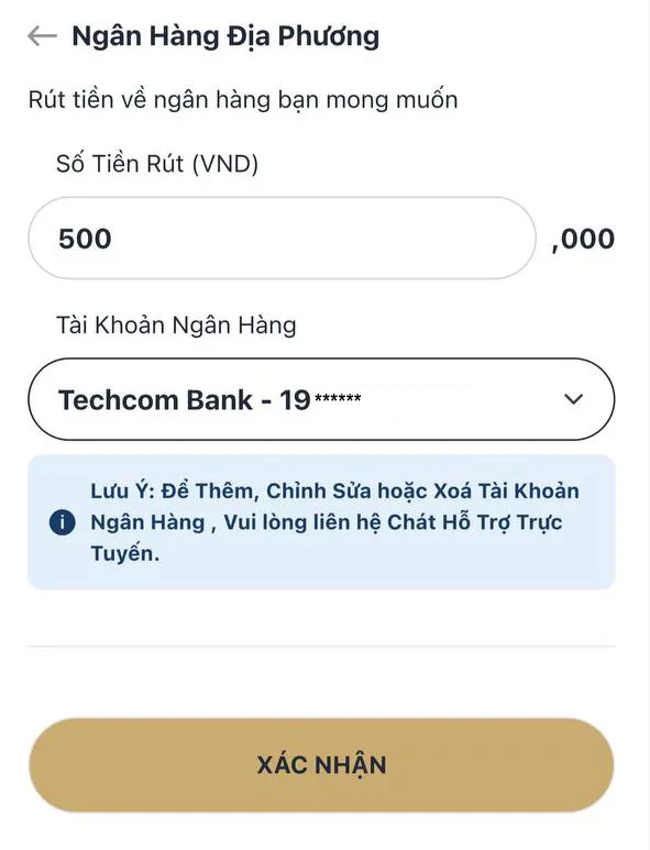 Lưu ý: Nếu muốn thêm hoặc sửa đổi tài khoản ngân hàng, bạn cần liên hệ trực tiếp với bộ phận Chat Hỗ Trợ Trực Tuyến.