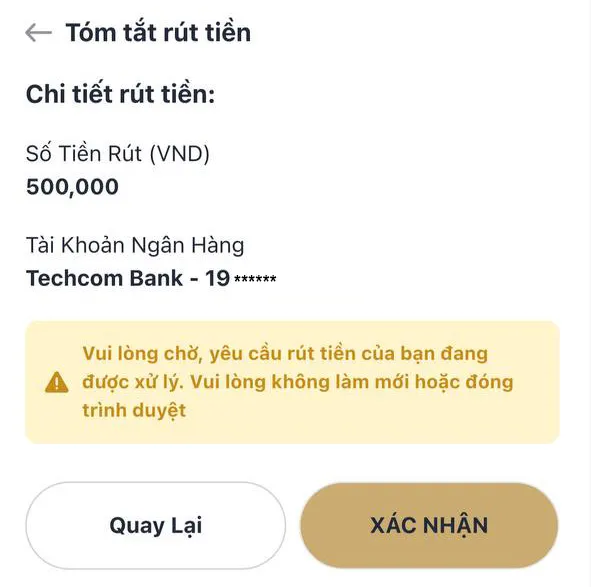 Hệ thống sẽ hiển thị bảng Tóm tắt rút tiền bao gồm số tiền thực nhận và chi tiết tài khoản ngân hàng.